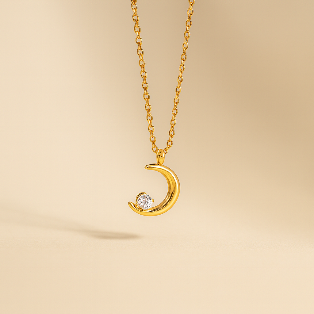 The Twilight Necklace features a beautifully sculpted crescent moon pendant finished in 18k gold plating, accented with a single shimmering zircon stone. Subtle, ethereal, and effortlessly elegant, it’s the perfect touch of quiet celestial charm.